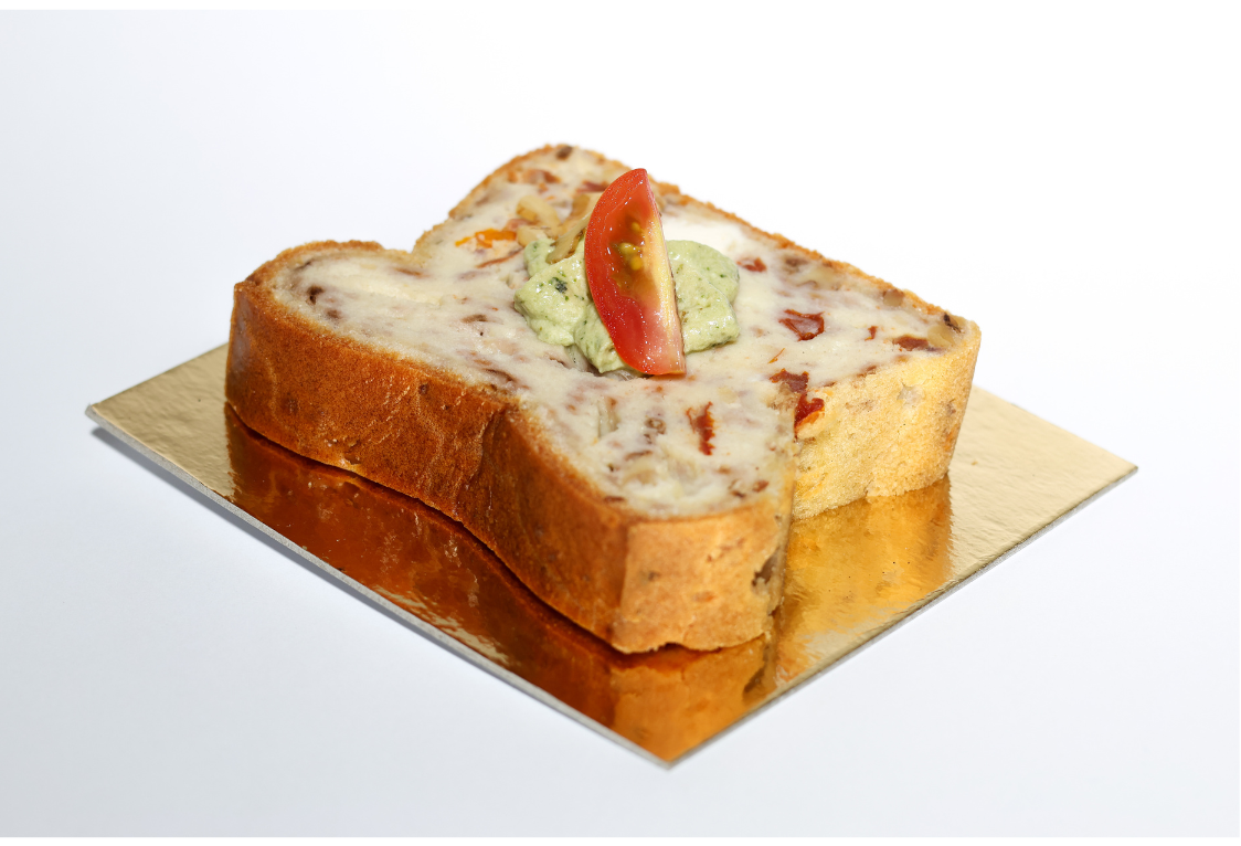 Cake aux Tomates Séchées, Feta, Cerneaux de Noix et Creme Pesto Coriandre