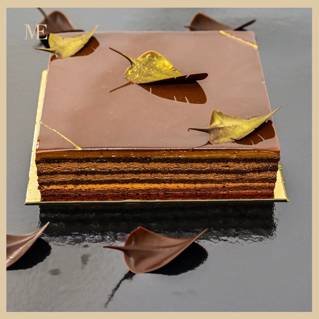 Crème onctueuse au pure chocolat grand cru, Biscuit moelleux au chocolat, Glaçage miroir noir